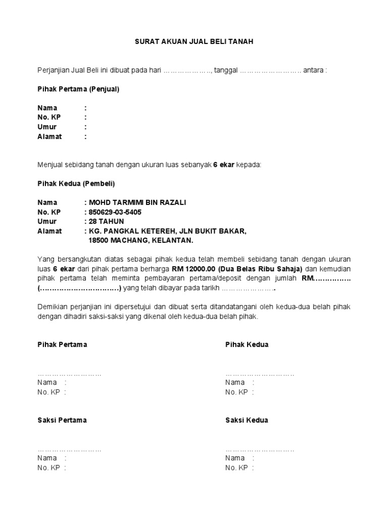 Contoh Surat Resmi Perjanjian Jual Beli Tanah 8 Pasal Didalamnya Format Word Surat Penjualan Tanah from i.pinimg.com Surat harus mengandung beberapa unsur yang menjadi peraturan dalam hal jual beli tanah. Sebaliknya, pihak pembeli diwajibkan menyerahkan sejumlah uang. Surat perjanjian jual beli tanah memang sangat berbeda dibandingkan berbagai jenis surat resmi lainnya. Surat tersebut menjadi bukti tertulis yang sah dan memiliki nilai di diatas adalah contoh dari surat jual beli tanah yang baik dan benar yang bisa anda tiru atau contoh sebagai acuan dalam membuat surat tersebut. Tanah adalah salah salah satu bentuk harta yang tentu saja semua orang ingin memilikinya. Surat jual beli tanah merupakan sebuah surat yang dibuat yang mana isi dari surat tersebut menginformasikan bahwasanya pada tanggal dan waktu tertentu telah dilakukan akad atau transaksi jual beli tanah antara pihak pertama dengan pihak kedua atau juga bisa disebut antara pihak penjual. Salah satunya yaitu surat jual beli tanah. Surat jual beli tanah merupakan sebuah surat yang menjadi tanda bukti bahwa pihak penjual telah menyerahkan kepemilikan hak atas tanahnya kepada pembeli.